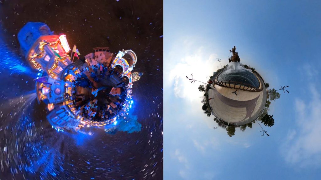 在全景功用所特有的“小行星”视角状况中,若是想要将被拍照者与所在环境完全告知清楚,就需求将全景相机略高于被摄者的头部的方位,不然在后期时、全景相机的视角畸变、会使你原本就很宽的脸盘完全夸大变形。许多时分用户在运用时、会感觉印象中的自己彷若是一个行走于星球地表上的“霍比特人”。假如呈现这个状况、那阐明你在前期翻开的方法仍是有些欠妥。不同于平面的运动相机拍照技巧,全景相机的沉溺感的完结、更在于要找准“参照物”。像游乐土中的气球、泡泡、人工雪等漂浮类的元素都可认为印象的画面张力供给或许,而抛升到高点的过山车、收支景观门檐、络绎于人山人海的人群相同可认为你的“终极大片儿”加上一分。 即就是只要一个人、画面上看起来也毫不孑立。